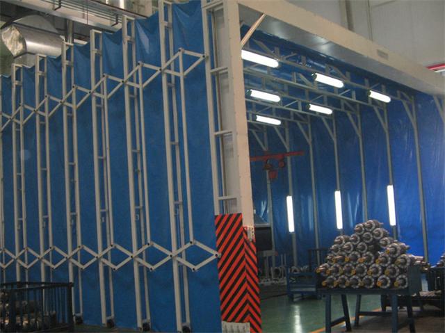 伸縮噴漆房通常采用多組可移動的框架有成平行四邊形狀的連桿連接而成,再點擊的驅動下帶動整個前室伸縮移動,框架之間由阻燃PVC布密封,行程一個隔離的獨立工作間,避免噴漆工作的車間環境污染。