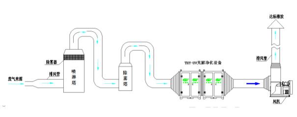 (1)廢氣經集氣罩收集后的廢氣由風管引入噴淋塔,去除廢氣中黏性的顆粒物,再通過除霧器降低水汽后進入下道工序。