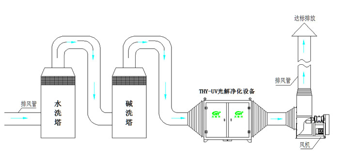化工廢氣處理考慮運營成本及安全性,本方案工藝路線擬定采用“通風系統(tǒng)(風機、收集罩、管道)+預處理系統(tǒng)(水噴淋塔+堿洗塔)+核心凈化系統(tǒng)(UV光解凈化設備)”來進行化工廢氣處理。工藝設備圖如下: